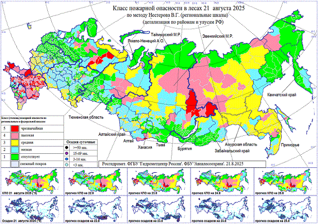Высокая, местами чрезвычайная пожарная опасность 22 августа в Ком, 22-24 августа в Архангельской области, на юге Воронежской, Белгородской и Саратовской областей, в Южном и Северо-Кавказском федеральных округах, в Донецкой, Луганской Народных Республиках, Херсонской и Запорожской областях, Ханты-Мансийском а.о., в Томской области, на юге Республики Алтай, западе Тывы, севере Красноярского края и Иркутской области, на западе Якутии и Чукотского а.о.