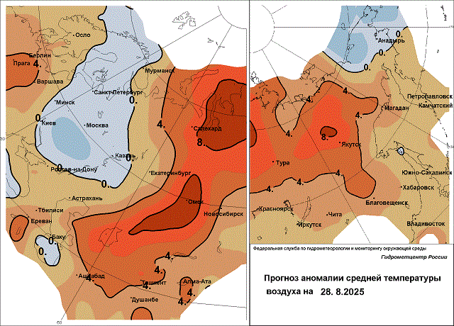 26-28 августа в северных регионах Сибири на Таймыре и в Туруханском районе антициклон обеспечит погоду преимущественно без осадков, лишь в Эвенкии местами прогнозируются кратковременные дожди. А преобладающая температура воздуха в дневные часы 26-28 августа повсюду будет сохраняться в пределах +20…+25 градусов, что выше климатической нормы на 8-10 градусов. 26 августа на Таймыре чуть прохладнее - столбики термометров поднимутся до +18…+23 градусов.