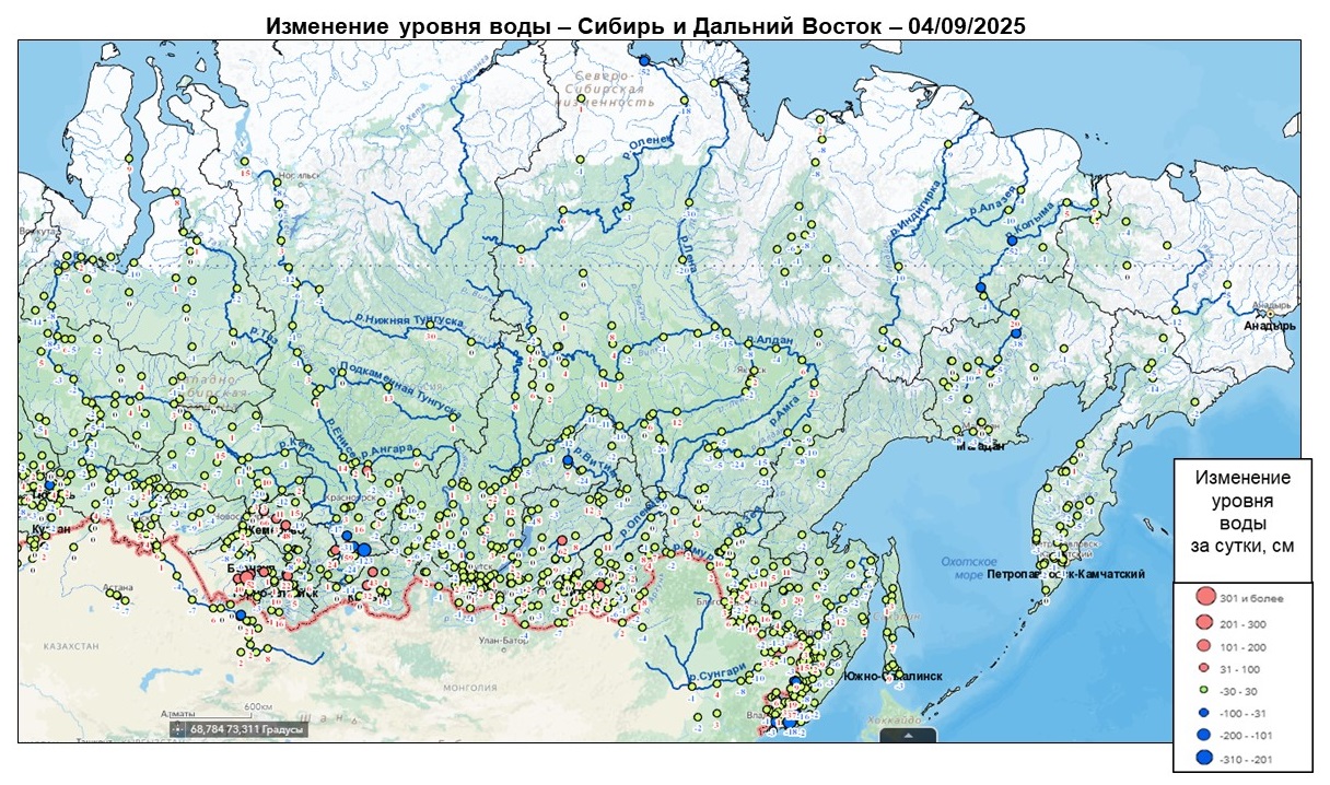 Уровень воды превышает неблагоприятную отметку на р. Сыда у с. Отрок, р. Кача у г. Красноярск, р. Большой Кемчуг у с. Большой Кемчуг (Красноярский край), р. Аргунь у с. Новоцурухайтуй (Забайкальский край) (Рисунок 3, 4).