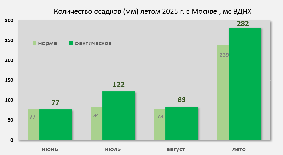 Осадки, выпавшие в период с июня по август, 282 мм, превысили норму на 18 %), в основном, за счет июля.
