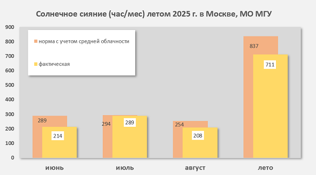 Продолжительность солнечного сияния, по данным метеообсерватории МГУ, в июле почти близка к норме, а вот в июне и августе это отставание было немного более заметным.