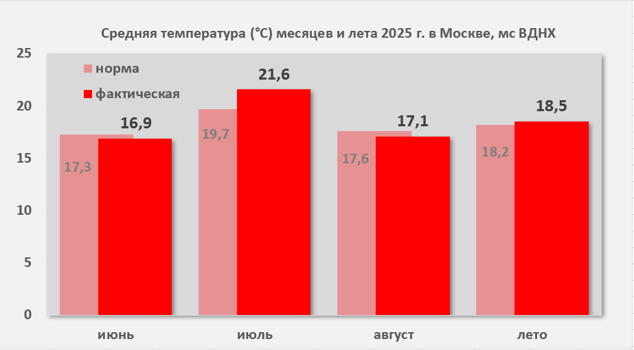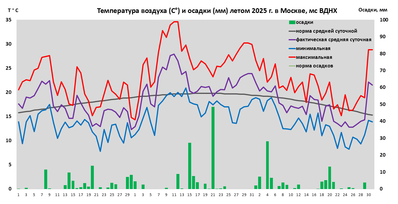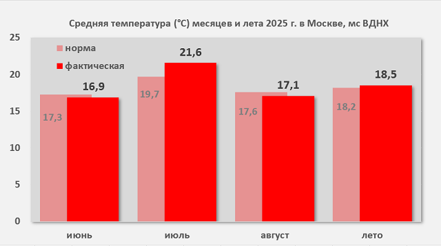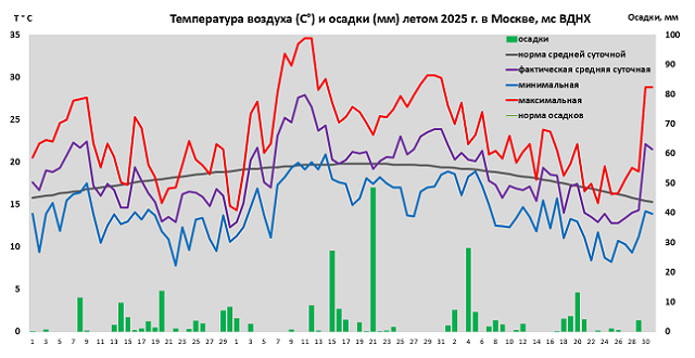 Средняя температура лета около нормы 18,5°С, по данным мс ВДНХ. Самый жаркий месяц июль, июнь и август близки к норме, но на отрицательном фоне.