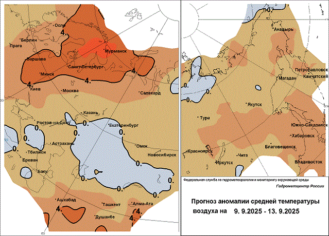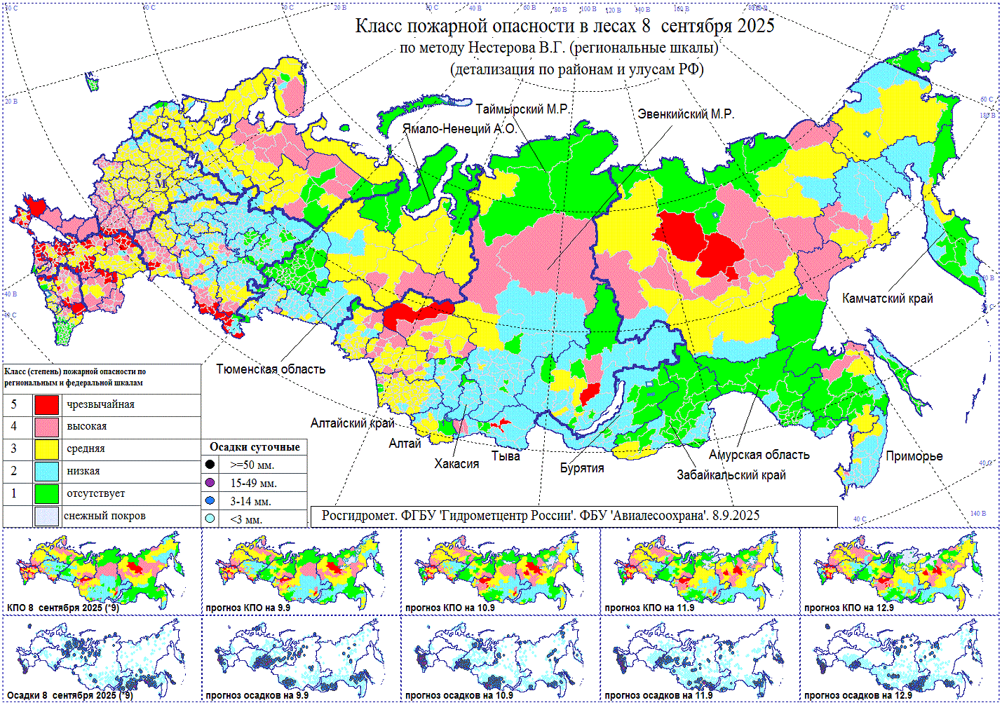 Высокая, местами чрезвычайная пожарная опасность 9-10 сентября в Херсонской области, на севере Красноярского края, 9-11 сентября в Коми, Мурманской, Архангельской областях, на юге Центрального и Приволжского федеральных округов, в Запорожской области, Донецкой и Луганской Народных Республиках, в Южном федеральном округе, Ставропольском крае, на севере Дагестана, в Томской, Новосибирской областях и Якутии.