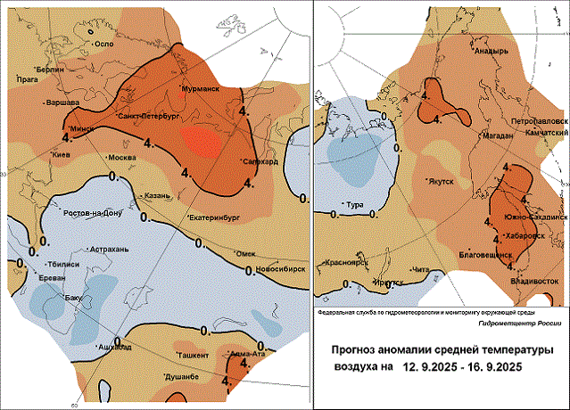 12-14 сентября. В Краснодарском крае на черноморском побережье ветер 12 сентября в районе Новороссийска до 22 м/с, 13-14 сентября в районе Анапа-Геленджик до 24 м/с. Заморозки на севере Приволжского федерального округа (температура ночью до -4°), в Башкортостане, в Курганской области (до -3°), в Томской области (до -2°), на юге Тюменской области, в Омской и Иркутской областях (до -5°). В Таймырском Долгано-Ненецком муниципальном районе Красноярского края 12-14 сентября на севере ветер до 22 м/с, 12 сентября на юге сильные осадки (мокрый снег, дождь).