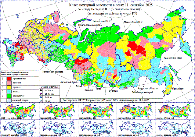 Высокая, местами чрезвычайная пожарная опасность 12-14 сентября в Мурманской, Архангельской, Псковской, Новгородской областях, Коми, в Центральном, Южном, на юге Приволжского федеральных округах, в Донецкой и Луганской Народных Республиках, Томской области, на юге Иркутской, западе Магаданской областей, в Якутии.