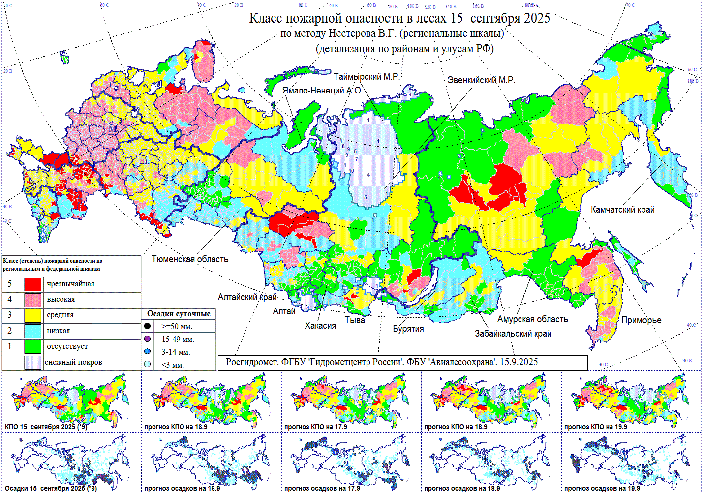 Высокая, местами чрезвычайная пожарная опасность 16-17 сентября в Псковской, Новгородской областях, 16-18 сентября в Архангельской области, Коми, в Центральном, Южном, на юге Приволжского федеральных округах, в Донецкой и Луганской Народных Республиках, на севере Дагестана, в Томской, Новосибирской областях, на юге Иркутской, западе Магаданской областей, в Якутии, на юге Приморского края, 17-18 сентября в Мурманской области.