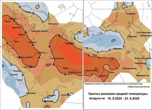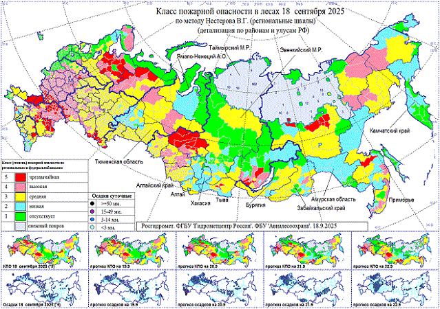 Высокая, местами чрезвычайная пожарная опасность 19-20 сентября в Мурманской, Архангельской областях, на юге Якутии, 19-21 сентября в Коми, в Центральном федеральном округе, на севре Южного и юге Приволжского федеральных округов, в Донецкой и Луганской Народных Республиках, Ханты-Мансийском а.о., Томской, Новосибирской областях, на юге Иркутской области, Приморского и Хабаровского краев, западе Магаданской области и Чукотки.