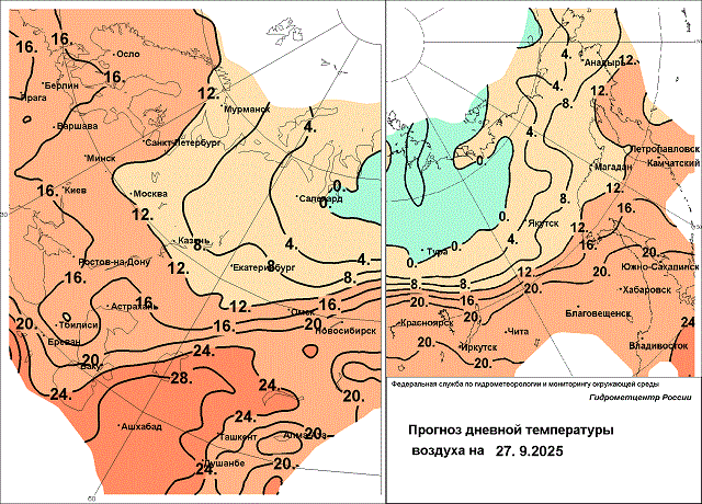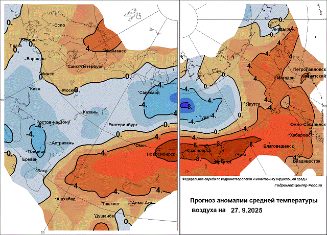 На севере Сибири погода уже преимущественно снежная, температурный фон понижен на 0-2 градуса. Ночью потрескивают морозы до -4….-10, местами на Таймыре до -14 градусов. В дневные часы от -3…+2 градуса на юге Таймыра, до 0…-5 градусов в Эвенкии, 0…+5, местами -5 градусов в Туруханском районе.