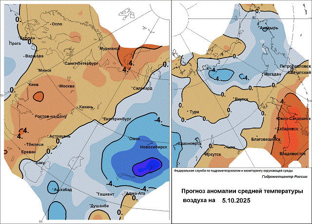 На севере Сибири погода будет снежной. В Эвенкийском и Туруханском районах 3-5 октября прогнозируется небольшой и умеренный снег, мокрый снег, на Таймыре небольшой снег ожидается лишь 3 октября. В северных краях немногим холоднее, чем на юге, а температурный фон даже повышен на 1-2 градуса. 3 октября на Таймыре днём -2…+3 градуса, в Эвенкии и Туруханском районе 0…+5, местами +10 градусов; 5 октября похолодает от -2…+3 градусов в Эвенкии, до -2…-7 градусов на Таймырском полуострове. В ночные часы температура воздуха практически не изменится и 3-5 октября составит -5…-11 градусов на Таймыре, -2…-7, местами -10 градусов в Эвенкии, -3…+2 градуса в Туруханском районе.