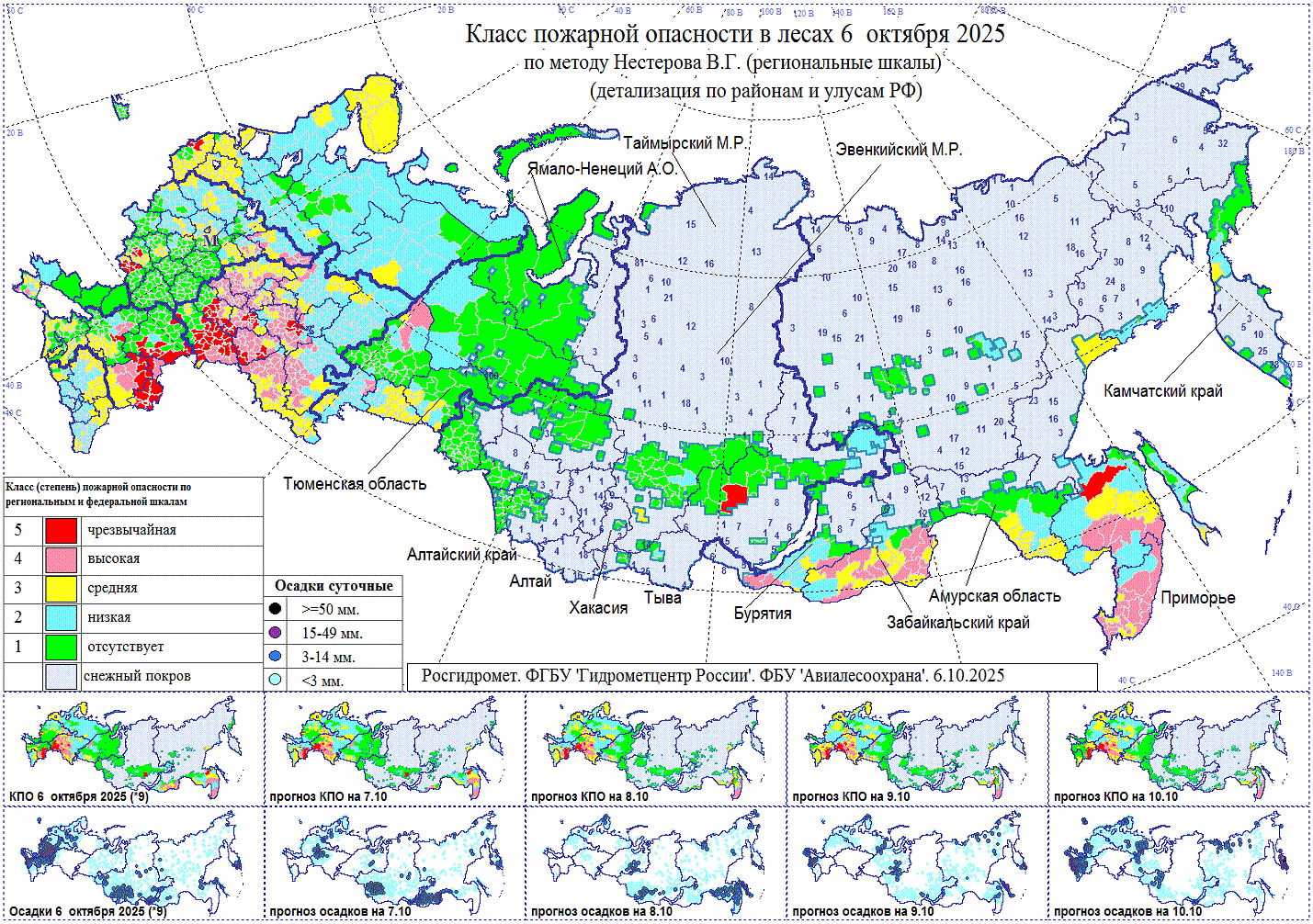 Высокая, местами чрезвычайная пожарная опасность 7-9 октября в южной половине Приволжского, на северо-востоке Южного федеральных округов, на крайнем юге Забайкальского и Хабаровского краев, в Приморском крае.