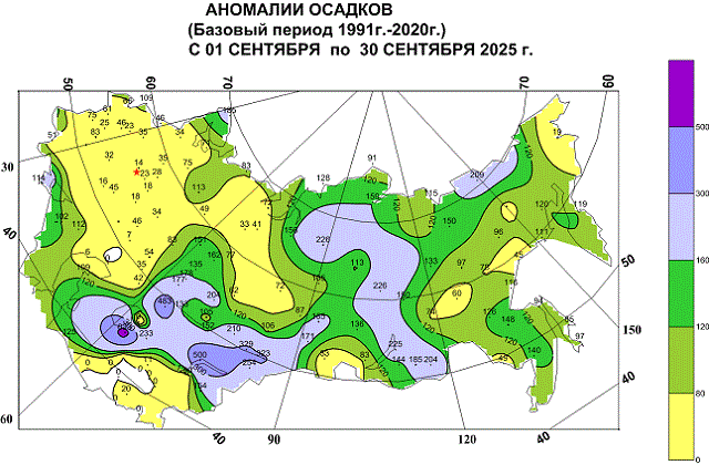 Аномалии осадков в России в сентябре 2025 г.