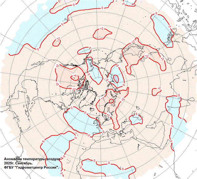 Аномалии температуры воздуха на Северном полушарии в сентябре 2025 г.