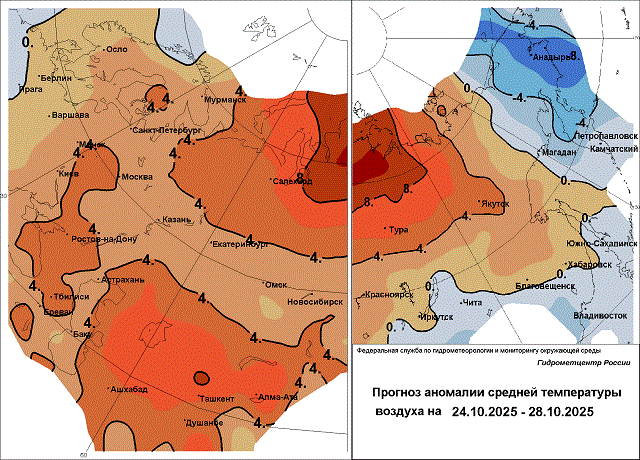 В Приморье, где теплее всего, днём 25-26 октября воздух прогреется до +8…+13 градусов, это выше нормы на 2-4 градуса; ночные температуры воздуха отрицательные, морозы составят -3…-9 градусов.