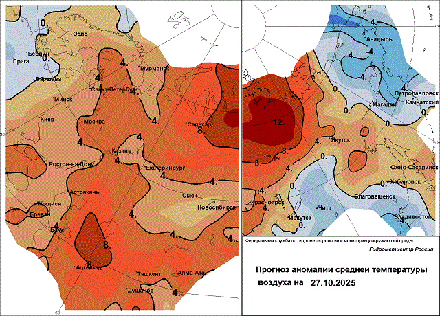 Температурный фон на юге России высокий. Максимальная температура воздуха выше климатической нормы на 3-6 градусов. 25-26 преобладающая температура воздуха днём составит +10...+17, местами +18…+21 градус; на черноморском побережье термометры покажут +15...+20 градусов, в районе Туапсе-Сочи до +22; в горных районах Северного Кавказа днем +7...+12, местами до +16 градусов, в Чеченской Республике и Дагестане до +20 градусов.