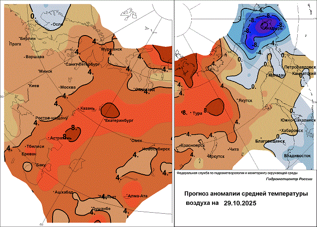 На северо-западе России погодные условия определяют циклоны, доставляющие обильные осадки и тёплый воздух с Атлантики. В регионе стоит осенняя дождливая погода, исключение составляют Ненецкий автономный округ и заполярная территория Коми, где идёт мокрый снег, а ночные температуры воздуха опускаются ниже нуля. Температурный фон повсеместно повышен на 2-6 градусов...