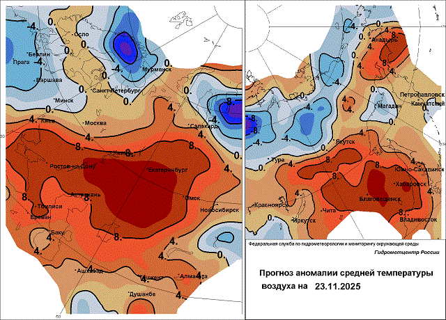В минувшие сутки 19 - ночью 20 ноября прошёл сильный снегопад в Эвенкии, оставив до 11 мм осадков, в Туруханском округе выпало до 13 мм влаги. Сегодня 20 ноября сильный снег, метель, ветер 13-18 м/с прогнозируются на юге Таймыра; в Эвенкии и в Туруханском округе также вероятны сильные осадки в виде снега, мокрого снега, а дневные температуры достигнут положительных значений: до +1 градуса в Эвенкийском округе, до +2 градусов в Туруханском. В пятницу в северных округах Красноярского края ожидаются небольшие и умеренные снегопады, сохранится ветер на Таймыре, однако температура воздуха начнёт понижаться и составит днём -2…-8 градусов в Эвенкийском и Туруханском округах; -10…-15, местами -23 градуса на Таймыре. В субботу и воскресенье снег будет небольшим, на Таймырском полуострове – без осадков. Продолжится значительное похолодание, температурный фон станет ниже нормы на 2-8 градусов, на Таймыре местами - на 11 градусов. 23 ноября ночью воздух остудится до -20…-25, местами до -30…-35 градусов в Эвенкийском и Туруханском округах, на севере Эвенкии морозы достигнут -40 градусов; на Таймыре минимальная температура опустится до -30…-35, местами до -42 градусов.