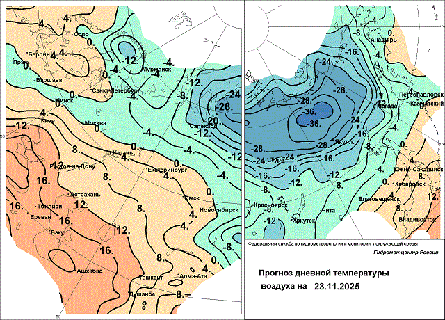 Центральные и южные районы Красноярского края, Республику Хакасия 21-22 ноября также ожидают осадки в виде снега, мокрого снега, днём – дождя, ветер усилится до 15-22 м/с, завьюжат метели. В горах южных районов и Хакасии пройдут сильные снегопады. 23 ноября умеренный снег выпадет лишь в центральных районах, на остальной территории снегопады будут небольшими. В Республике Тыва 21-23 ноября намечается лишь небольшой снег. 21 ноября, за исключением Тывы, максимальная температура воздуха сохранится положительной 0…+7 градусов, в Тыве достаточно холодно -9…-14 градусов. 22-23 ноября наиболее тепло в дневные часы будет в южных округах Красноярского края и в Хакасии, термометры покажут 0…-5, местами -10 градусов. 22 ноября в центральных районах похолодает, а в Тыве потеплеет до -3…-8 градусов. Ночью 23 ноября столбики термометров опустятся до -8…-13 градусов, в Тыве до -18…-23, местами -28 градусов.