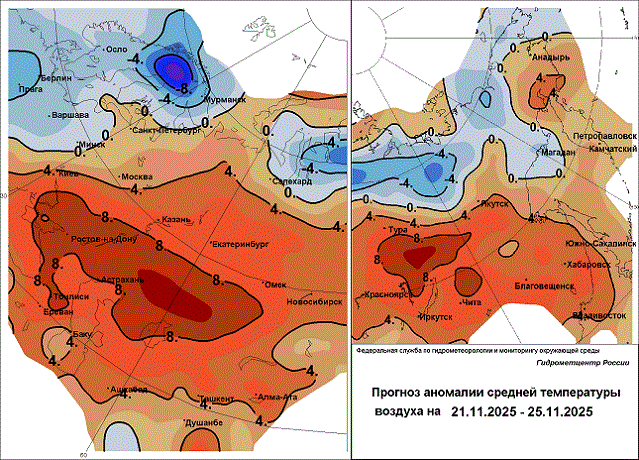 21 ноября. В Новосибирской, Томской, Кемеровской областях, Алтайском крае и Республике Алтай снег, мокрый снег, гололедные явления, метель, ветер 15-20 м/с, сильная гололедица. В горах южного округа Красноярского края и на севере Иркутской области сильный снег. В горных районах Бурятии и Камчатского края лавиноопасно. На арктическом побережье Чукотского автономного округа в районе острова Врангеля ветер 25-30 м/с.