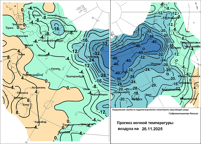 Мурманскую область завтра не минуют снегопады от умеренных до сильных, морозы в ночные часы опустятся от -5…-10 градусов на крайнем юге до -25…-30 градусов на крайнем севере; максимальная температура воздуха днем составит -3…-8, местами -13…-18 градусов. Во вторник местами посыплет небольшой снежок, лягут туманы и изморозь; ночью подморозит до -12…-17, местами до -18…-23 градусов, в дневные часы похолодает до -9…-14 градусов. В среду 27 ноября очередной циклон принесёт новую порцию небольшого и умеренного снега, метели и усиление ветра до 15-20 м/с, сохранятся туманы и изморозь. Ночные морозы ослабнут до -9…-14, местами -5…-10 градусов, днём потеплеет до -2…-7 градусов.