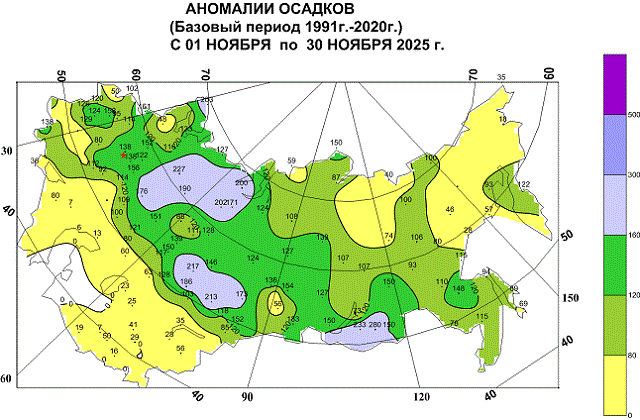 Средняя месячная температура воздуха в ноябре на ЕТР оказалась больше нормы на 2-6°, на юге Сибири – на 2-4°, а на севере Сибири и на большей части Дальнего Востока она заметно меньше нее. На ЕТР прошедший ноябрь второй самый теплый в истории регулярных метеонаблюдений в стране, т.е. с 1891 г. Еще теплее на ЕТР был только ноябрь 2013 г. на 0.1°. Также вторым самым теплым он оказался в Южном, Северо-Кавказском и Приволжском федеральных округах и третьим – в Центральном федеральном округе. Однако за счет аномально холодной восточной части страны средняя температура воздуха в ноябре 2025 г. в России оказалась хоть и больше нормы, но ненамного. Она ранжируется только в третьем десятке самых больших среднемесячных значений для ноября.