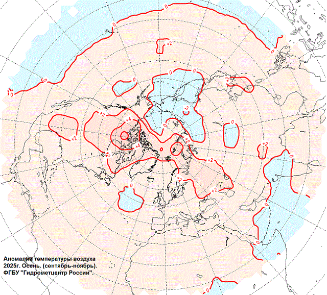 Аномалии температуры воздуха на Северном полушарии (сентябрь-ноябрь) 2025 г.
