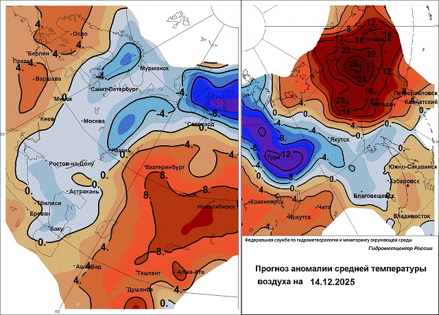 С продвижением циклона на восток на Русскую равнину устремится холодный арктический воздух, повсеместно начнёт понижаться температура воздуха, аномалии минимальной температуры станут отрицательными и с каждым днём все больше и больше отдаляться от нормы. Если 13 декабря на севере, северо-западе страны ночные температуры воздуха будут ниже средних многолетних значений на 2-4 градуса, то к 16 декабря аномалии достигнут -9…-15 градусов. В Поволжье ситуация аналогичная: в Волго-Вятском регионе 13 декабря, на Средней Волге 14 декабря минимальная температура воздуха станет ниже нормы на 1-3 градуса, а к 16 декабря – на 6-10 градусов. На юге Европейской России похолодание произойдёт в более мягкой форме: 12-13 декабря минимальная температура ещё будет опережать норму на 2-6 градусов, а 14 декабря аномалии станут отрицательными и составят -2…-5 градусов.