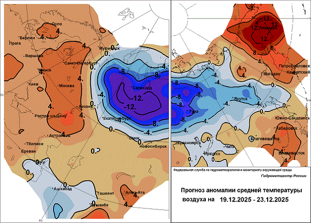 19-20 декабря. В Свердловской области 19 декабря сильный снег, 20 декабря на севере сильный мороз (температура до -43°). В Амурской области, Еврейской автономной области, Хабаровском крае сильный снег. В Магаданской области сильный снег, 20 декабря метель, ветер 15-20 м/с. В Камчатском крае сильный снег, в прибрежных районах метель, ветер 19 декабря 19-24 м/с, 20 декабря 25-30 м/с.