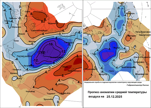 На Северном Кавказе 23 декабря в Ставропольском крае, Карачаево-Черкесии, Кабардино-Балкарии, 24-25 декабря на большей части округа намечаются дожди и влажные снегопады, и как следствие - гололедно-изморозевые явления. В Ингушетии и высоких горах Кабардино-Балкарии задует ветер в порывах до 15-20 м/с. Преобладающая температура воздуха 24-25 декабря составит ночью -2…+3, в горах -1…-6, в высокогорье до -7…-12 градусов; днём термометры покажут -4…+1, местами до +6…+9 градусов, 25 декабря в горах максимальная температура может понизиться до -6…-11 градусов.