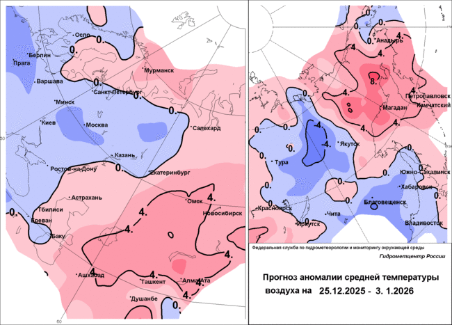 В субботу, 27 декабря, облачно, небольшой снег. Ночью в Москве -2...0°, по области -5...0°, ветер северный 6-11 м/с. Днем в Москве -2...0°, по области -5...0°, ветер северный с переходом на южный 6-11 м/с. Гололедица, местами сильная.