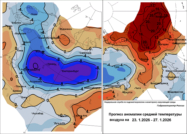 В северо-восточных регионах Дальневосточного края значительно теплее обычного. Максимальные аномалии наблюдаются на Чукотке, где дневная температура воздуха 23-25 января составит -12…-18, местами -2…-8 градусов, в континентальной части до -22…-27 градусов, на востоке 23 января -2…+3 градуса.