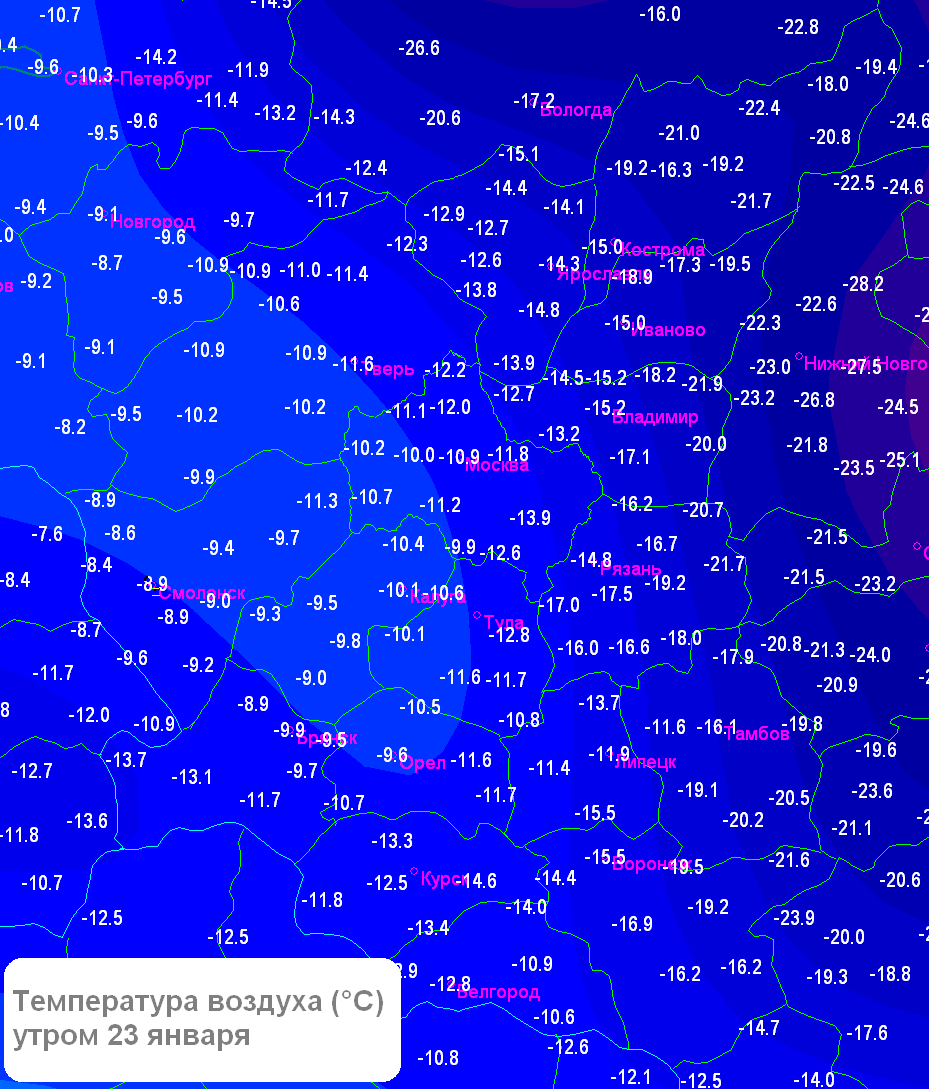 25 января и ночью 26 января в ЦФО сохранится антициклональный характер погоды, существенных осадков не ожидается, в ночные часы на большей части округа морозная погода с температурой -25…-20°, на востоке до -29°, днём преобладающая температура -18…-11°.