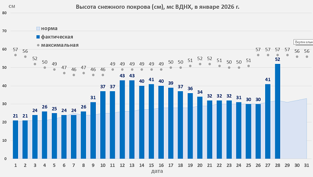 Норма высоты снежного покрова от 30 см 26 января до 33 см 31 января. Рекордные значения за этот же период 56-57 см отмечались в 1956 г. (и в 1994 г. 26 и 27 января).