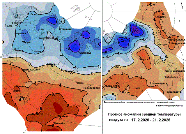 На севере и в средней полосе европейской территории России (ЕТР), в области влияния скандинавского антициклона, будет преобладать малооблачная морозная погода с температурой воздуха на 4-9° ниже средних многолетних значений.
