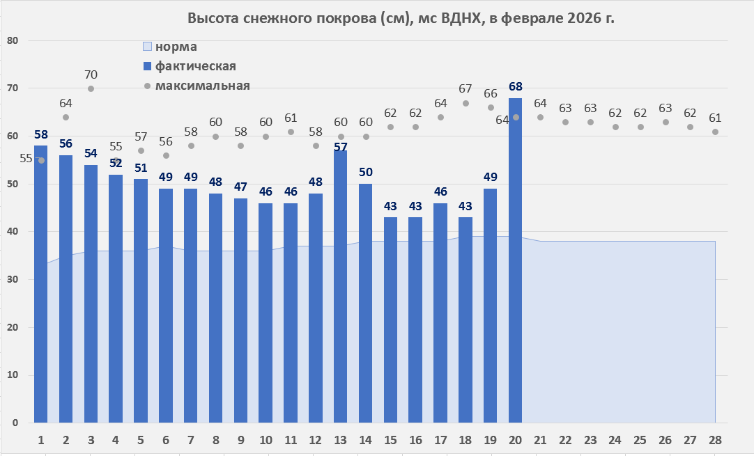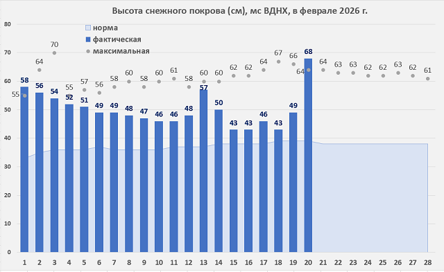 - На мс ВДНХ утром 20 февраля высота снежного покрова составила 68 см, это выше прежнего абсолютного максимума, 64 см, отмеченного всего два года назад (в 2024 году).