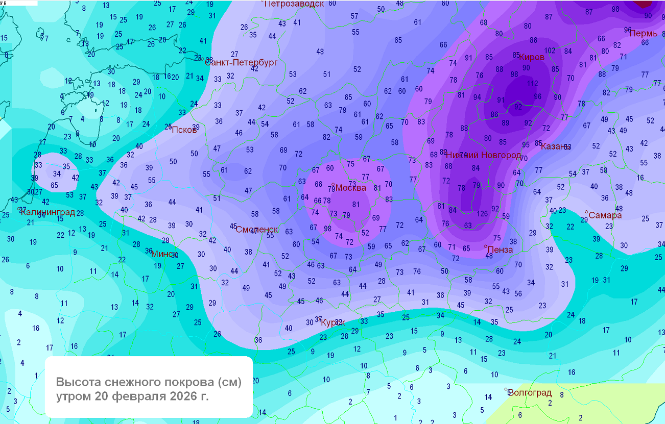 За сутки 19 февраля и ночь 20 февраля 2026 г. в Москве выпало до 20-30 мм осадков в виде снега (максимально на метеостанции Балчуг 25 мм за 24 ч, 19 февраля, из них 18 мм днем 19 февраля). Прирост высоты снежного покрова - до 26 см (мс Балчуг и ВДНХ 25-26 см).