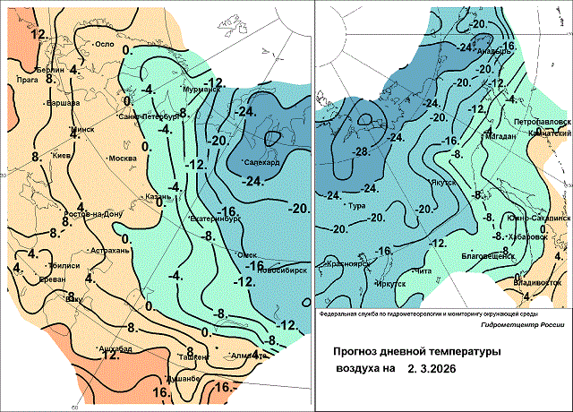 На юге Камчатки 26 – ночью 27 февраля также сохранялись сильные снегопады, оставив до 7 мм влаги. 28 февраля - 2 марта на Камчатском полуострове пройдёт лишь небольшой снег. 1-2 марта на юго-западном побережье края ветер разгуляется до 25-30 м/с. Преобладающая максимальная температура воздуха 1-2 марта на юге полуострова составит -3…+2 градуса, на севере -1…-6 градус, местами до -12…-15 градусов, в Пенжинском районе до -20…-23 градусов.