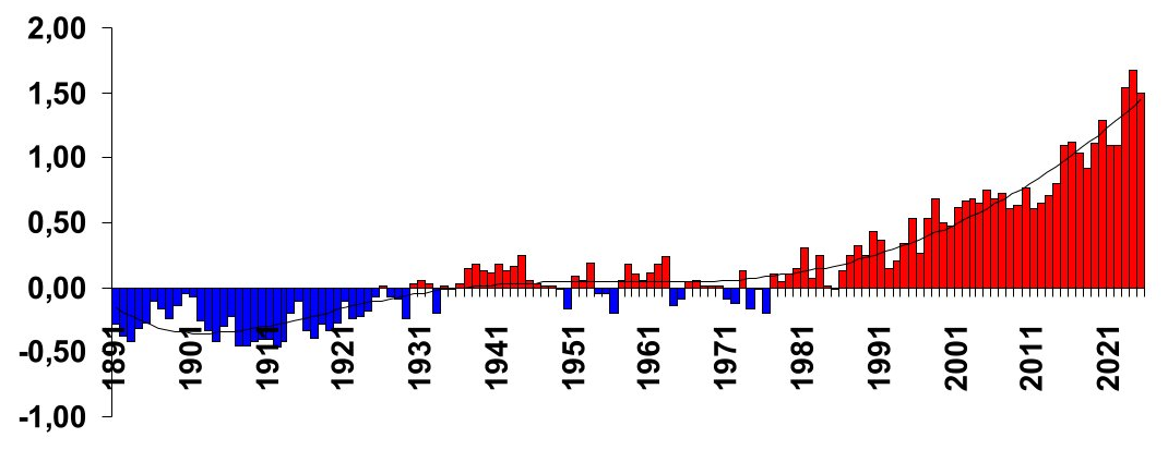 Аномалии средней годовой температуры воздуха на Северном полушарии Земли в 1891-2025 гг.