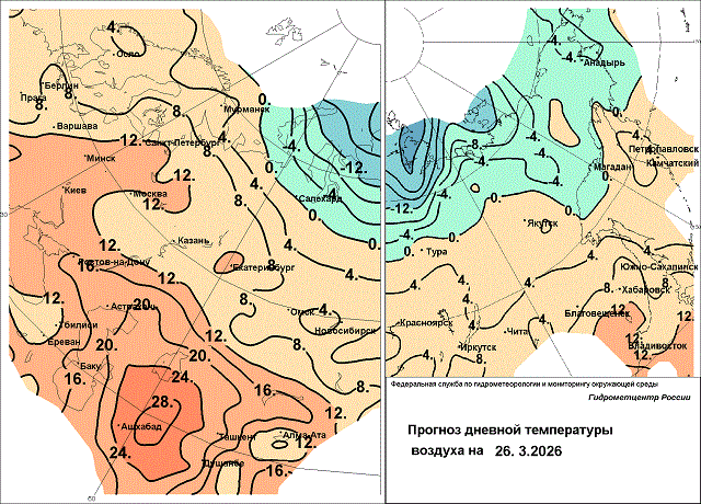 24 марта в юго-западной Сибири повсеместно ожидаются небольшие и умеренные осадки ночью в виде снега и мокрого снега, днём в виде мокрого снега и дождя. Наиболее тёплая погода будет отмечаться в Томской области и Республике Алтай, где максимальные температуры воздуха составят +3…+8 градусов, немного прохладнее в Новосибирской области +1…+6 градусов, В Кемеровской области и Алтайском крае температура воздуха днём будет изменяться от -1 до +5 градусов. 25-26 марта с прибытием антициклона с запада в Новосибирской области и на Алтае осадки прекратятся, небольшие дожди с мокрым снегом пройдут лишь местами в Томской и Кемеровской областях. Практически повсеместно термометры днём покажут +2…+8 градусов, в Республике Алтай воздух прогреется до +6…+11 градусов 25 марта, до +8…+13 градусов 26 марта.