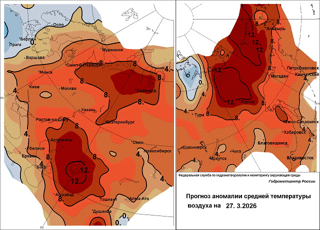 Фон средней суточной температуры воздуха на юге России повышен на 5-7 градусов , местами аномалия достигает +10 градусов. 26-27 марта температура воздуха ночью составит +5...+10 , при прояснениях до +1…+3 градусов, 26 марта в Волгоградской области до -1. Днем термометры покажут +10...+16, местами до +18…+20 градусов, в Астраханской области и Калмыкии до +22 градусов. В горных районах максимальная температура воздуха составит +5…+11 градусов, в отдельных районах Северного Кавказа до +16.
