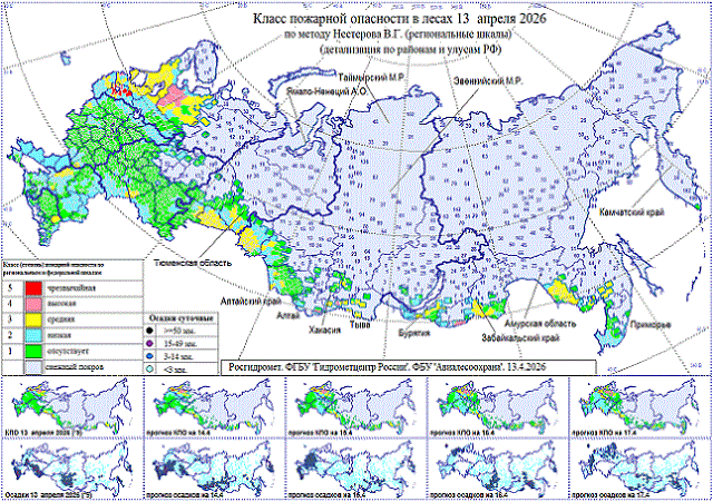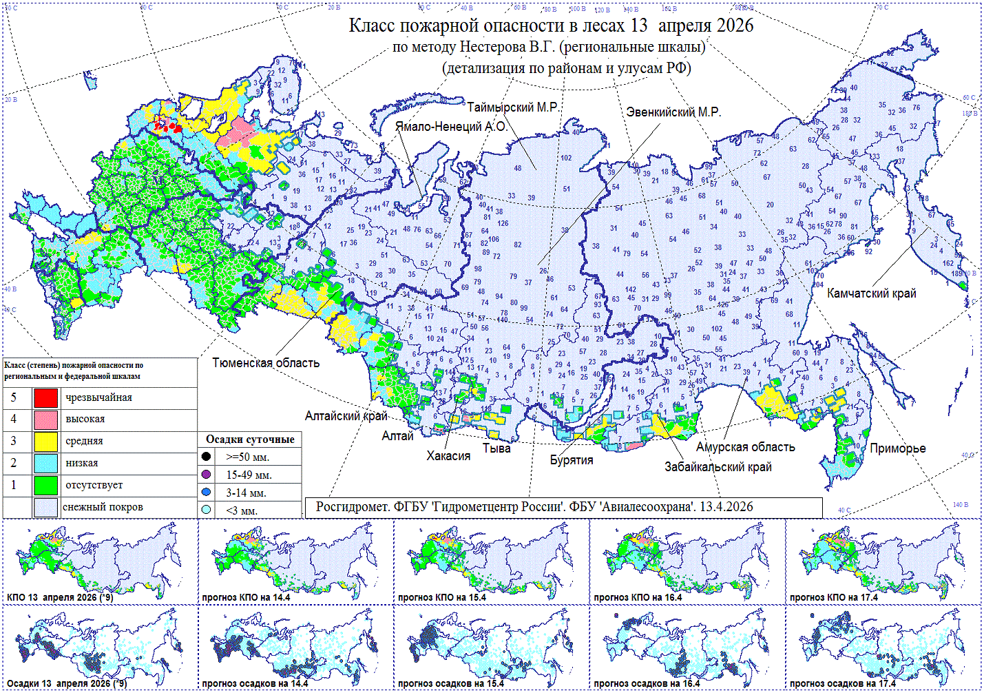 14 апреля. На юге Приволжского федерального округа дождь (ночью сильный), гроза, град. В Донецкой Народной Республике заморозки (температура до -3°). На севере Астраханской области и в Калмыкии ночью сильный дождь со снегом, гроза, ветер 15-20 м/с. В Адыгее дождь, гроза, град, ветер 15-20 м/с. В прибрежных районах Магаданской области снег, метель, ветер 19-24 м/с. На севере Камчатского края мокрый снег, ветер 25-30 м/с.