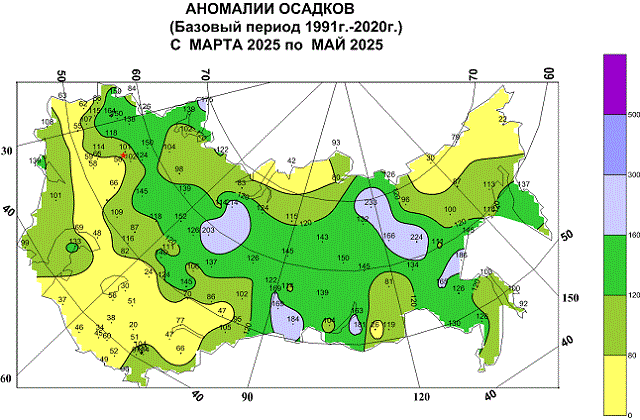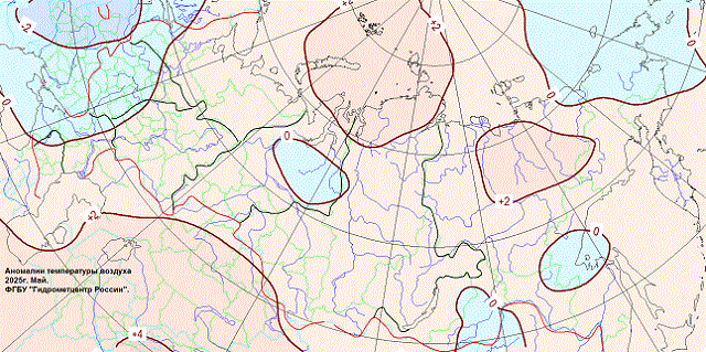 В мае на большей части России средняя температура воздуха близка к норме. Заметно выше нее (на 2° и более) она на северо-востоке, а также на Таймыре, Ямале, Новой Земле и других арктических островах этого региона. Холоднее обычного май оказался в центральных и западных районах ЕТР.