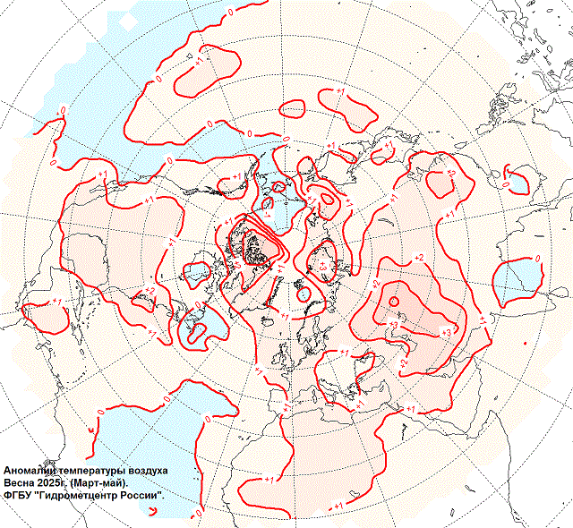 Аномалии температуры воздуха на Северном полушарии весной (март-май) 2025 г.