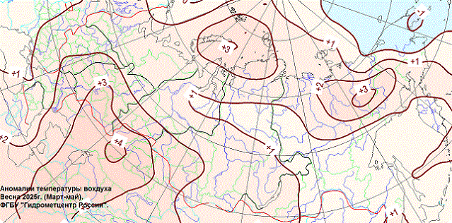 Аномалии температуры воздуха в России весной (март-май) 2025 г.